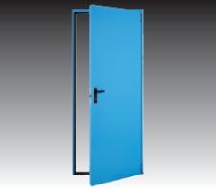 Porta REVER ad una anta in lamiera d'acciaio, completamente zincata. Anta tamburata con interposta struttura rigida in fibra alveolare e telaio angolare assiemato da fissare con zanche o tasselli (fornitura cliente). Serratura standard con foro cilindro ed inserto per chiave tipo patent, compresa. Maniglia antinfortunistica colore nero. Nr. 2 cerniere portanti e 3 rostri di tenuta in battuta lato cerniere. Verniciatura di serie con polveri epossipoliestere con finitura a struttura antigraffio goffrata, colore standard pastello turchese - tonalità chiara per l'anta (NCS4020-B50G) e più scura per il telaio (NCS5020-B50G).