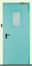 Porta PROGET tagliafuoco REI 120 conforme UNI 9723 ad una anta, in lamiera d'acciaio, completamente zincata, con telaio angolare assiemabile da murare. Serratura tagliafuoco con marcatura CE secondo EN 12209 con foro cilindrico ed inserto per chiave tipo patent, compresa. Maniglia antinfortunistica colore nero con anima in acciaio. Nr. 2 cerniere di cui una a molla per l'autochiusura e una portante con sfere reggispinta e viti per la registrazione verticale. Rostro in tenuta in battuta lato cerniere. Rinforzi interni per maniglioni antipanico e chiudiporta. Verniciatura di serie con polveri epossipoliestere con finitura a struttura antigraffio goffrata, colore standard pastello turchese – tonalità chiara per l'anta (NCS4020-B50G) e più scura per il telaio (NCS5020-B50G). Su ordinazione verniciatura in tinta RAL o decorativa NDD – Ninz Digital Decor. Porte senza battuta inferiore con senso di apertura da definire